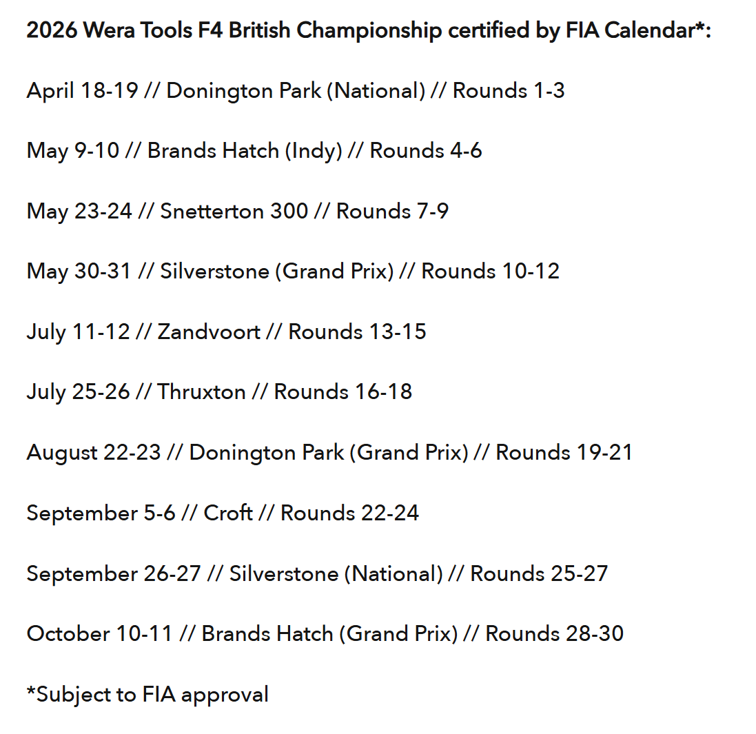 The British F4 Season consists of 10 rounds. 9 rounds all over the UK, with one round at Zandvoort in the Netherlands.